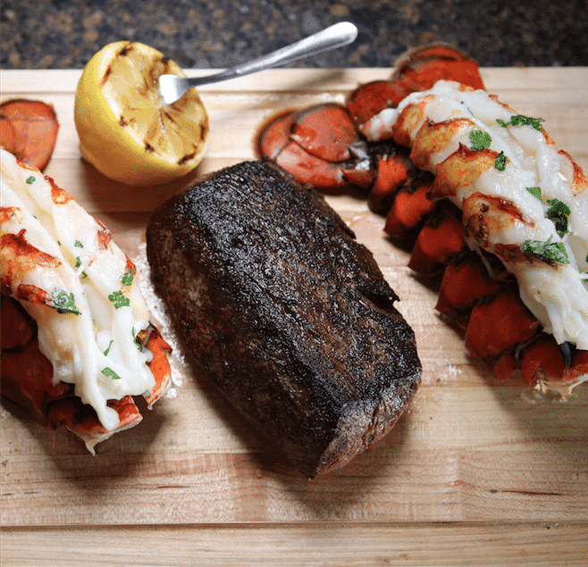 Surf & Turf can refer to many different combinations of beef and seafood. Our Surf & Turf is the combination most true to the term and served in high-end steakhouses – Filet Mignon and Lobster Tails.